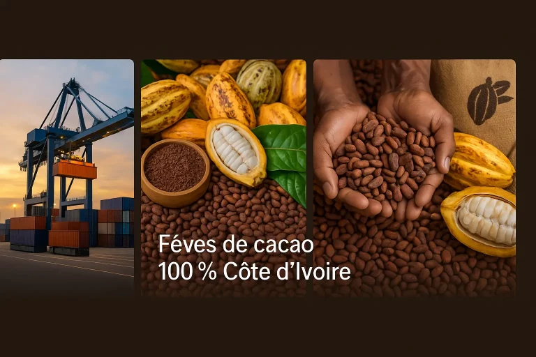 Lots disponibles en plusieurs tonnes · fermentées & séchées au soleil · pour chocolateries, beurre/poudre & cosmétique.